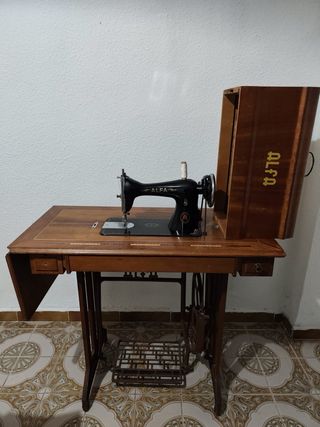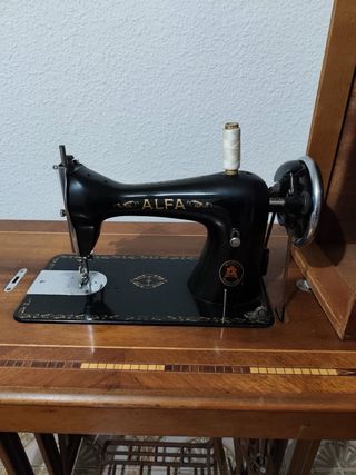 Máquina de coser clásica de la marca Alfa, con un diseño elegante y atemporal. - Acabado en color negro brillante. - Detalles dorados decorativos. - Incluye un carrete de hilo blanco.