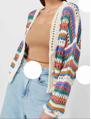 Cárdigan de punto con un diseño vibrante y alegre. Talla M Tiene una pequena mancha por esta guardada, por lo demás está como nuevo usado 2x. - Diseño de rayas multicolor. - Aberturas de crochet. - Cierre de botones.
