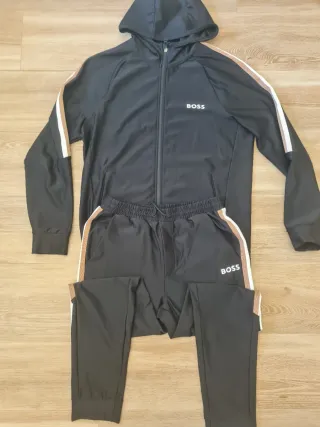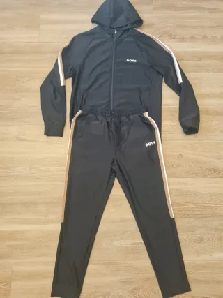 Conjunto de chándal BOSS en color negro con detalles en beige. Produto ORIGINAL Chaqueta talla L Pantalón talla S Como nuevo, usado una única vez.