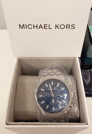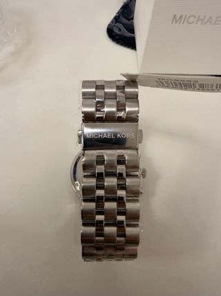 Elegante reloj Michael Kors con esfera azul y detalles plateados. - Caja y brazalete de acero inoxidable. - Bisel con incrustaciones. - Diseño de cronógrafo.