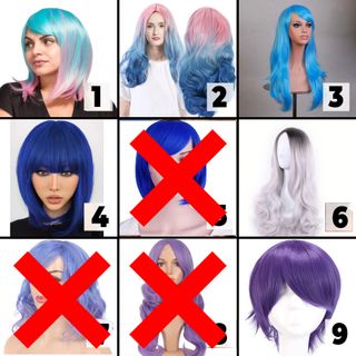 Varias pelucas sintéticas de colores. Para disfraz, fiesta, cosplay, teatro, despedidas de soltero, etc. Posibilidad de venta en mano en Barcelona. 4€ por peluca, sólo dispongo de una unidad de cada. Artículos de exposición en tienda. No han sido usados.