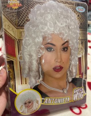 Peluca de época inspirada en María Antonieta. Perfecta para disfraces y eventos temáticos. - Diseño voluminoso y rizado. - Adorno floral y perlas.