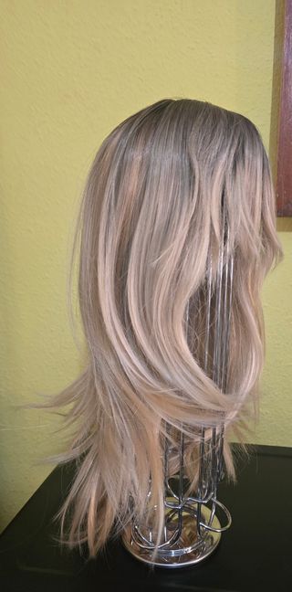 Preciosa peluca sintética, con mezcla de tonos rubio ceniza y platino. Luce una textura suave y ondulada. - Color: mezcla de gris y blanco. - Ideal para un cambio de look.