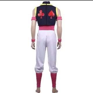 Completo cosplay de Hisoka del anime Hunter x Hunter. Ideal para convenciones o eventos. - Incluye top negro con detalles de corazones y amarillo. - Pantalones blancos con detalles. - Brazaletes y muñequeras. - Peluca roja característica. la peluca está estilizada y recortada, bastaría con aplicar laca para fijarla de nuevo