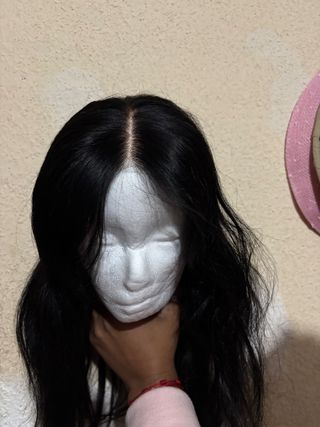 Peluca de pelo humano con una raya central. - Pelo humano natural. - Color negro intenso. - Raya central definida.
