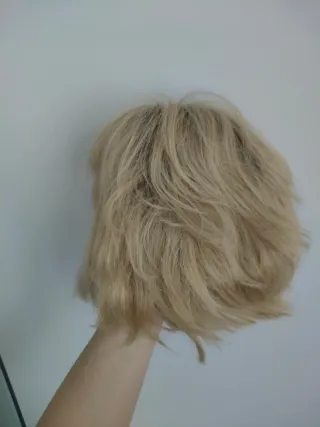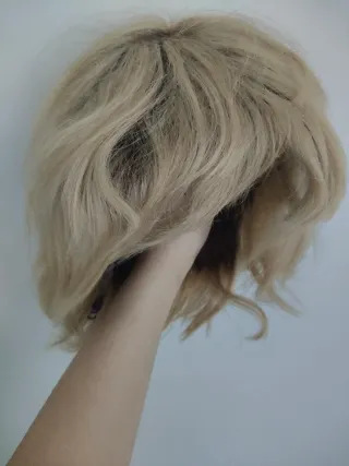 Peluca de pelo semi natural con un bonito degradado rubio. - Textura ondulada. - Longitud larga. - solo se ha usado una vez, y aún no está bien peinada.