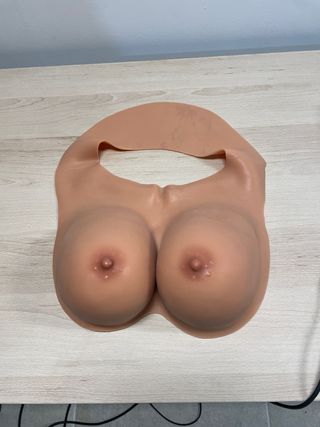 Prótesis de silicona para el pecho, con forma de senos realistas. Incluye una peluca color castaño, no es pelo natural pero es muy realista. - Material: Silicona. - Color: Beige.