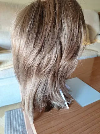 Peluca de cabello sintético con un bonito degradado de rubio ceniza a tonos más claros. Incluye gorro interno. Sin estrenar. - Fibra sintética de alta calidad. - Diseño con capas y flequillo cortina. - Aspecto natural y suave al tacto.