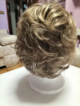 Peluca con un estilo moderno y natural, ideal para complementar tu look. Usada en alguna ocasión - Tonos castaños con mechas rubias. Es de fibra - Textura rizada y voluminosa.