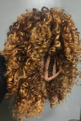 Peluca con rizos definidos y un degradado de color entre castaño y rubio. - Textura rizada. - Combinación de tonos castaños y rubios. -Una vez puesta no parece que sea una peluca. -Muy buena calidad