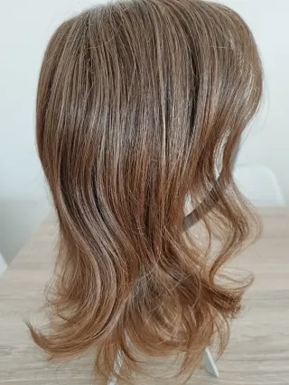 Peluca de señora realizada en cabello natural, color rubio oscuro, media melena, ondulado. Peluca oncológica.