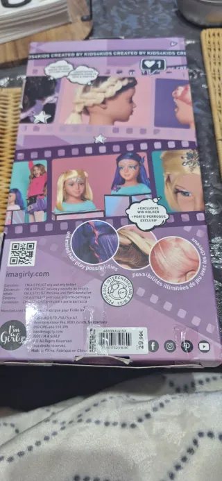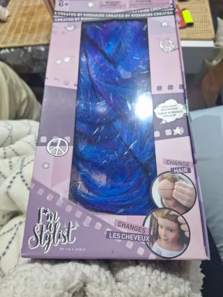 Peluca de fantasía con tonos azules y morados, ideal para juegos de peinado. Incluye un soporte exclusivo para guardarla. - Peluca de colores vibrantes. - Soporte para peluca incluido.