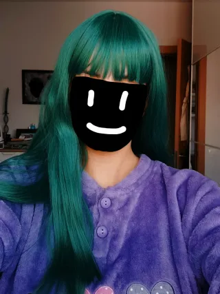 Peluca larga de color verde oscuro. Tiene un flequillo recto y el pelo liso. Puede ser usada para Cosplay de Reina (Pichi Pichi Pitch) o Maki (Jujustu Kaisen). Está como nueva y es fácil de peinar. - Longitud: Larga - Estilo: Liso con flequillo