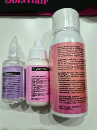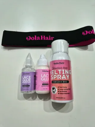 Kit completo para la instalación y mantenimiento de pelucas. - DolaHair Lace Glue: Adhesivo de alta fijación. - DolaHair Lace Glue Remover: Solución para retirar el adhesivo. - DolaHair Melting Spray: Spray fijador para un acabado natural.