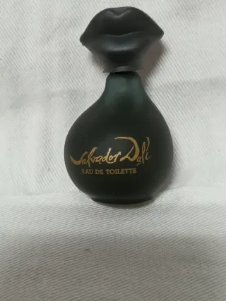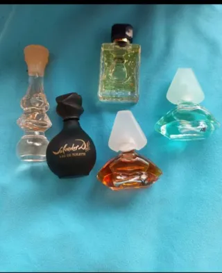 Conjunto de miniaturas de fragancias.Año 1990 - Botella de vidrio con diseño escultural. - Frasco negro con etiqueta Salvador Dalí Eau de Toilette. - Botella de vidrio con líquido verde y tapa negra. - Frasco de vidrio con líquido ámbar y tapa blanca. - Botella de vidrio con líquido turquesa y tapa blanca.