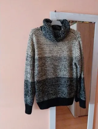 Jersey de chico con cuello alto y diseño de rayas horizontales.no tiene etiqueta pero hace como una L - Tejido grueso y cálido. - Cuello alto enrollado. - Diseño a rayas en tonos beige y gris.