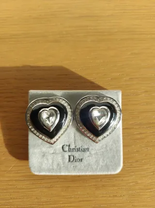 Pendientes Christian Dior con un diseño de corazón y acabado en esmalte negro. Cristal en el centro y en los bordes del exterior.