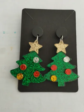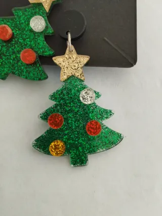 Estos pendientes festivos tienen forma de árbol de Navidad verde brillante con adornos de colores y una estrella dorada en la parte superior. - Diseño de árbol de Navidad. - Adornos de colores (rojo, amarillo, plateado). - Estrella dorada brillante en la punta.