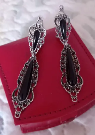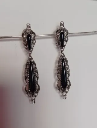 Pendientes largos, vintage, con doble piedra Onix en forma de lágrima. Posiblemente, en plata, aunque no van sellados. Medidas en las fotos.