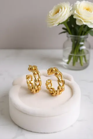 Preciosos pendientes de aro con eslabones de cadena. - Fabricados en acero quirúrgico acabado en oro de 18klt - Resistentes al agua y al deslustre - Hipoalergénicos - Totalmente nuevo sin usar 👁Se entrega en su embalaje original dentro de una bolsa de gasa decorada para regalo 🎁 📣Cajas de atrezzo para las fotos NO incluidas