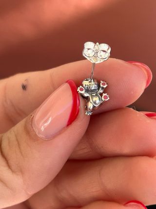 Adorable par de pendientes de Stitch de Disney, de la marca Pandora. - Diseño detallado de Stitch. - Acabado en plata y detalles en rosa y azul.