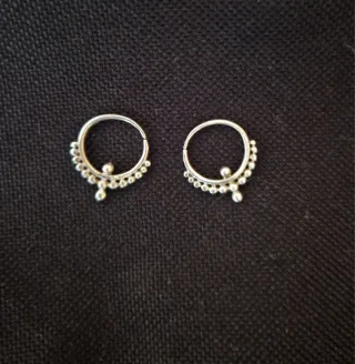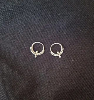 Par de pendientes de plata con un diseño delicado y adornado con pequeñas bolitas. - Diseño circular con colgante. - Acabado plateado. HAGO LOTES