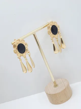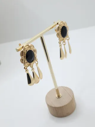 Elegantes pendientes con un diseño llamativo. - Fabricado en goldfilled. - Detalle central en color negro. - Colgantes dorados en forma de lágrima.