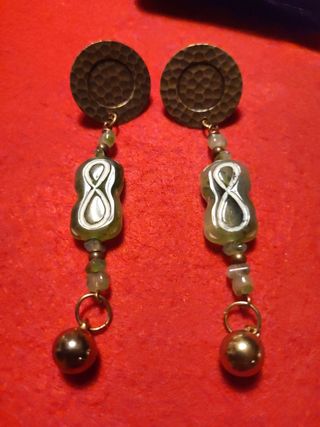 Pendientes con motivos Incas. Son antiguos, pero no se han usado casi nada. A uno de ellos les falta el enganche para la oreja. Miden 10 cms de largo.