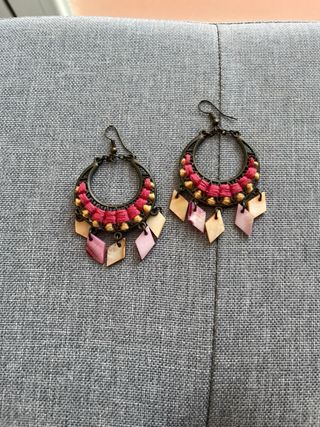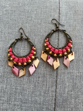 Preciosos pendientes artesanales. Son dos pendientes de aro con detalles en hilo rosa y dorado, y colgantes de nácar. Los aros son de metal con un acabado antiguo. - Diseño único y llamativo. - Perfectos para añadir un toque boho a tu look. - Hechos a mano con materiales de calidad.