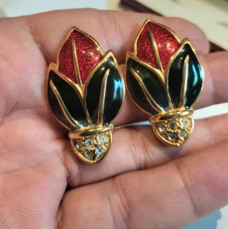 Elegantes par de antiguos pendientes con diseño de esmaltada de Leritz - Detalle de rojo y negro. - Adorno de pequeñas piedras brillantes en la base. - Acabado dorado. - Cierre de clips