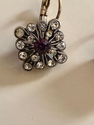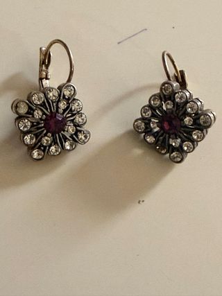 Elegantes pendientes de estilo antiguo con un diseño floral y una piedra central morada. - Detalle de pequeñas circonitas alrededor de la piedra principal. - Cierre de tipo presión. - Acabado en plata dorada.