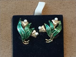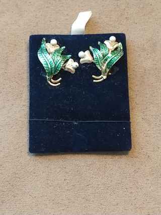 Pendientes antiguos con hojas y flores pintadas. a pesar de ser nuevos sin usar presentan algún deterioro, ver en fotos, de ahí el precio tan económico aunque sea una antigüedad.