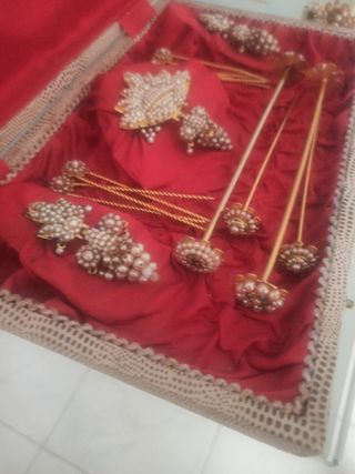 juego de aderezo de fallera. Compuesto de dos juegos de peinetas, pendientes, broches, horquillas, etc. En buen estado. Hay un pendiente defectuoso, ver última foto. Se vende el conjunto completo.