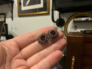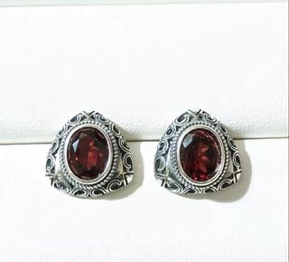 Pendientes de estética vintage y claramente victoriana-romántica, con diseño trabajado en relieve y piedra central ovalada de color rojo profundo. La montura presenta acabado plateado envejecido, con trabajo ornamental de inspiración antigua. La piedra muestra el tono característico del granate, con reflejos vino oscuro según la luz.
