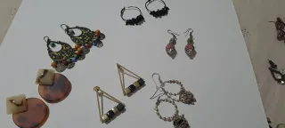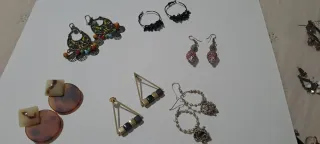 Varios modelos de pendientes. 1€ por pareja o parejas que aparecen en cada foto. 1€ por foto. *Pendientes que cuelgan con bolas azules *Pendientes larguitos en Z de tres colores, se pueden poner rectos *Pendientes colgantes de concha *Pendientes colgantes azules en madera *Pendientes larguitos de estrella en negro y fucsia *Pendientes en tono azul (los 3) mariquitas, tortugas y chanclas *Pendientes con caritas en 3 colores (amarillo, verde y rosa) *Pendientes de dado azules y pinchos de silicona en verde y amarillo. *Pendientes medio aro en dos tamaños verde y rojo con 3 perlitas. Hago precio por lote.