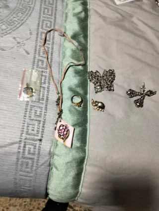 1x cadena con cuerdas en negro y plata y detalle circulo de cristal de murano con detalle floral. 1x gargantilla perlas bolas blancas 1x gargantilla étnico con detalles tipo cuentas o bolitas en negro y bronce 1x pendientes monedas chapitas en diferentes metales envejecidos bronce y plata 1x pendientes aro con bolitas en color blanco y dorado 1x pendientes colgantes madera de diferentes tonos tierra: naranja, bronce… 1x colgante tipo perla 1x anillo verde plástico trasparente ajustable detalle luna y estrella 1x anillo conejo ( ligeramente desgastado) 1 x anillo cuadrado con piedra redond