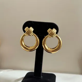 Elegantes pendientes con un diseño de aro y detalle cruzado. - Acabado chapado en oro de 18 quilates ,de alta calidad - Diseño circular con un toque moderno. - Hipoalergénicos - Resistente al agua - No se estropea - No se pierde el color