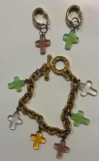 Conjunto de pulsera y pendientes con colgantes en forma de cruz. - Pulsera con cadena dorada y cierre de mosquetón. - Pendientes de aro dorados. - Colgantes de cruz en varios colores translúcidos.