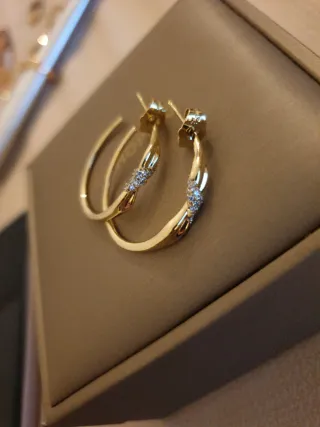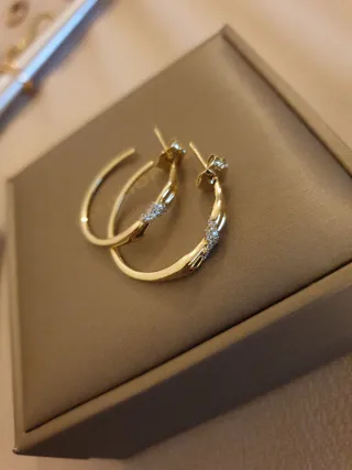 Elegantes pendientes tipo aro, nuevos y listos para estrenar. Vienen presentados en su caja original, lo que los hace perfectos para regalar. - Diseño de aro. - Acabado chapado en oro.