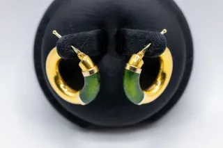 Elegantes pendientes de aro tipo huggie. - Fabricados en oro de 18 quilates. - Detalle central en verde. - Peso: 3,20gr - El ancho de apertura del aro es de 0,5cm. Aconsejable para lóbulo pequeño. Ref #J523 Precio no negociable