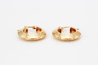 Elegantes pendientes de aro con un diseño inspirado en la greca, medida exterior 2 cms.diámetro aproximadamente. - Fabricados en oro. - Diseño de greca. - Cierre de presión.