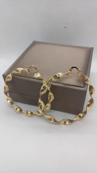 Elegantes pendientes de aro con un diseño retorcido y acabado brillante. - Chapado en oro de 18 quilates. - Diseño de rizado - Cierre seguro No pesan Tamaño Grande 6 cm G Hipoalergenico No cambia de color Resistente al agua Hago envíos