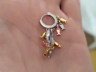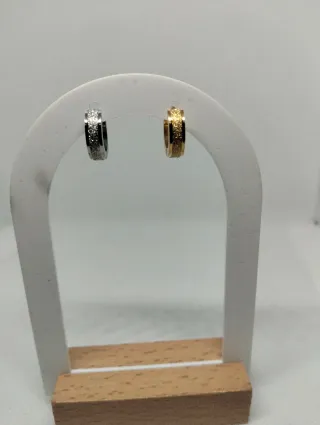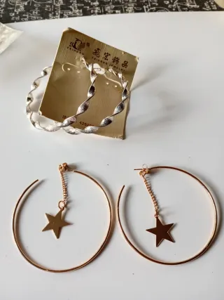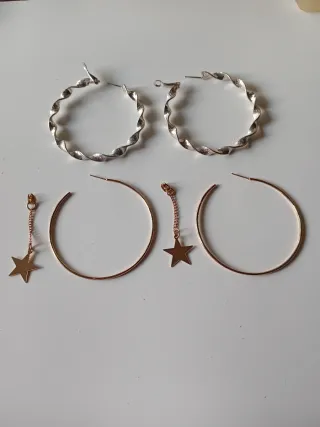 Conjunto de dos pares de pendientes, uno en tono dorado y otro en tono plateado, ambos con un diseño de aro y un colgante de estrella. 7€ cada par - Diseño de aro con espiral (plateados). - Diseño de aro liso con colgante de estrella (dorados).