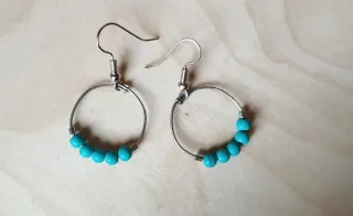 Pendientes hechos a mano con un diseño moderno y llamativo. - Aro metálico plateado. - Cuentas de color turquesa. - Cierre de anzuelo.