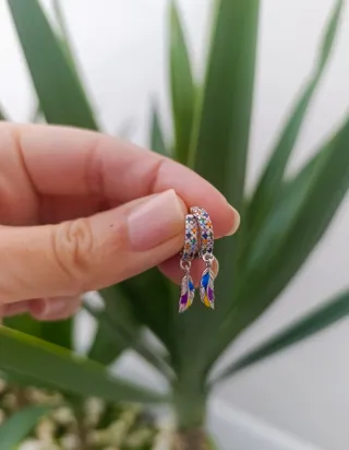 🩷Pendientes de aro con un diseño de plumas colgantes. Plata S925 de calidad 🔺Detalle de circonitas en el aro. 🔺Colores vibrantes en las plumas. 🔺 Recoger en domicilio o ENVÍO CON WALLAPOP