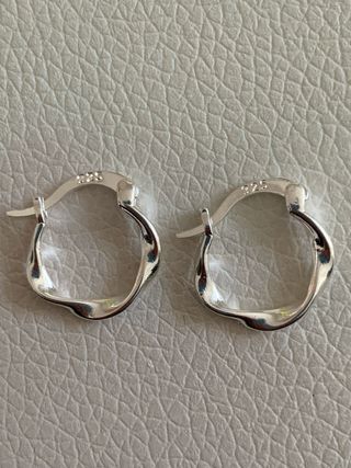 Elegantes pendientes de aro de plata. - Diseño retorcido y moderno. - Cierre seguro y cómodo. - Sello 925 visible.