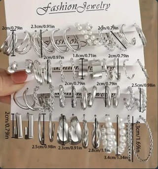 Conjunto de seis pendientes con un diseño moderno y elegante. - Varios estilos de aros. - Acabado plateado brillante.