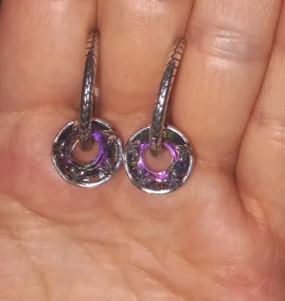 Pendientes de aro de plata 925 bañada en oro amarillo de 18K con rodolitas moradas y topacios blancos Es un regalo y no me dieron ticket regalo. Valen en tienda 119€ - Cierre seguro y cómodo.