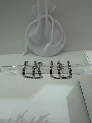 Elegantes pendientes de aro de la marca Pandora. - Diseño de argolla con circonitas. - Plata de ley. - Nuevos sin estrenar. Me los regalaron por mi cumpleaños y se me pasó el tiempo de devolución. Los quería dorados