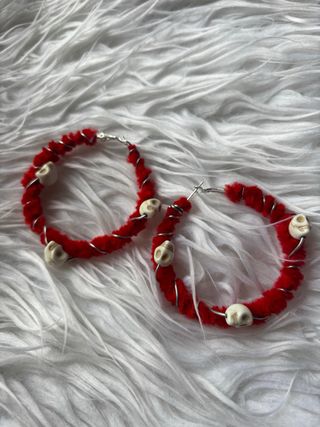 Pendientes de aro con un diseño llamativo. - Base de aro cubierta con material rojo. - Adornados con pequeñas calaveras blancas. - Cierre de aro plateado.